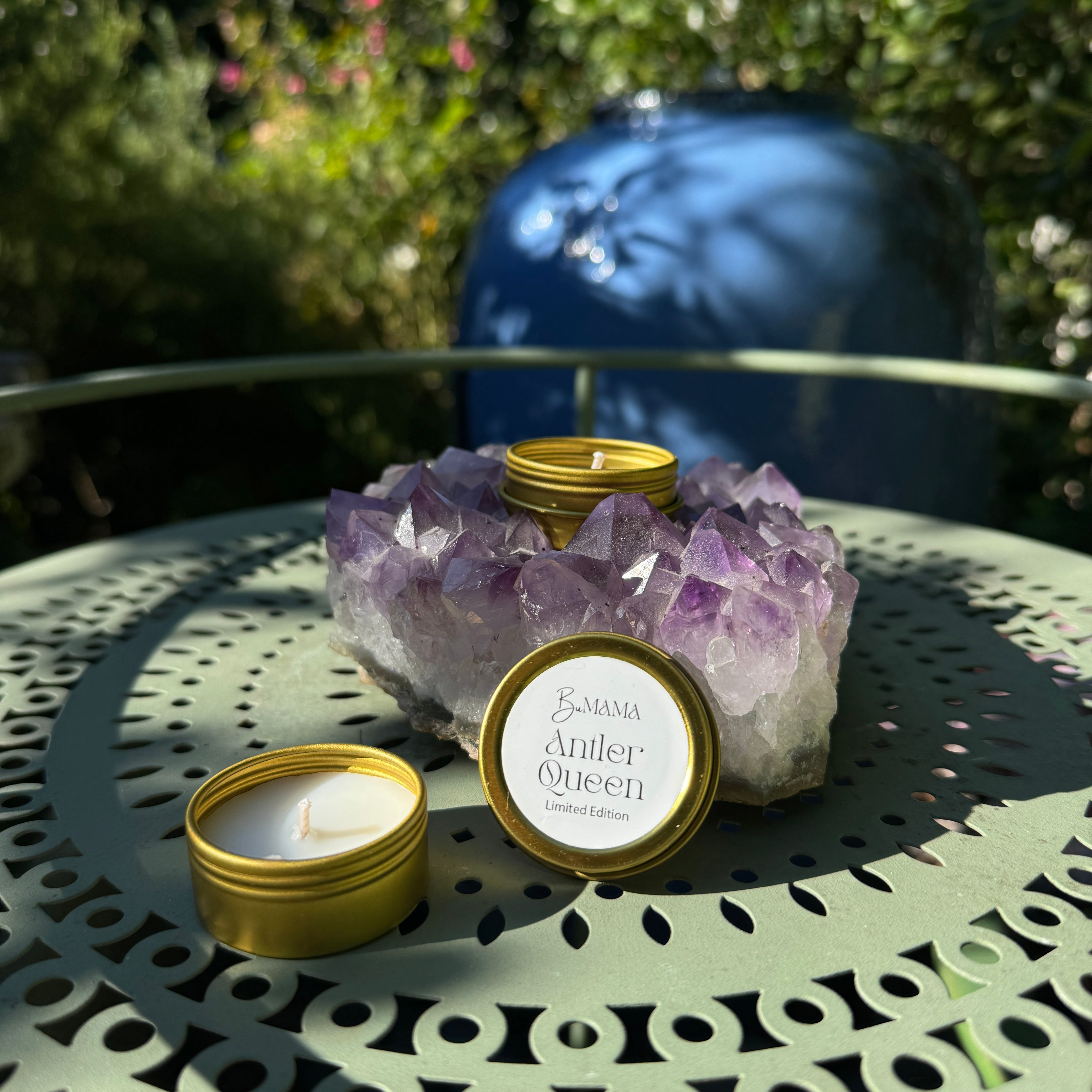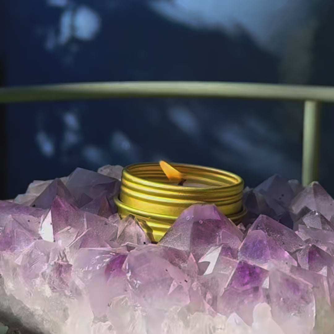 Top notes of sweet violet ignite the senses with a cosmic touch. A radiant heart of velvet amber and sensual santal unfolds, while a base of vanilla bean grounds the blend in soft, earthy elegance. A trail of celestial calm lingers long after the flame.